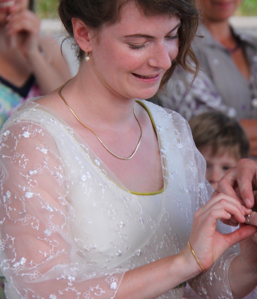 Chercher la bonne ligne, le joli tombé, essayer … Chercher la bonne technique pour cette boutonnière serpentant dans la dentelle, le bon montage pour que tout soit raccord et soigné … pour que tout paraisse simple et évident . Et s’appliquer, les doigts dans la dentelle et la soie… voilà pour moi ! Un peu de sueur je dois bien l’avouer, mais un plaisir incroyable surtout ! Si cette robe est loin d’être l’unique raison d’un si beau sourire, je suis vraiment très heureuse qu’elle en soit le témoin et l’atour !
