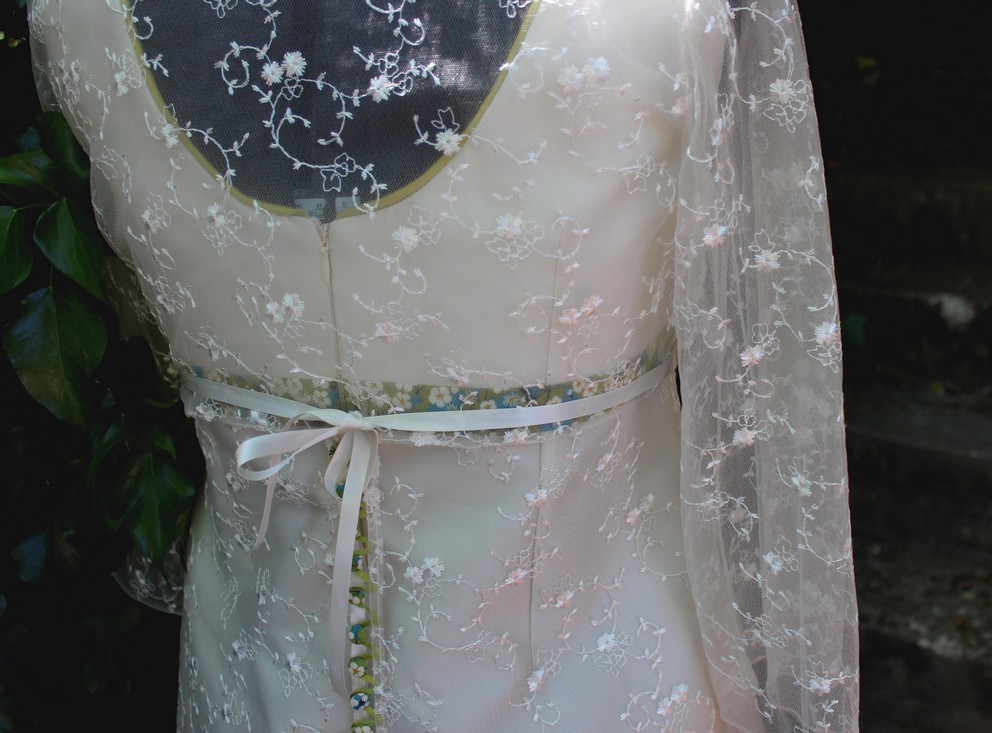 J’ai eu beaucoup de chance : une petite mariée charmante, avec des gouts très proches des miens, et beaucoup d’imagination. J’avais un beau croquis dessiné avec l’aide d’une amie et une envie de « chic » mais simple, un peu bohème quand même … en guise de feuille de route. Coup de cœur pour un mikado de soie, un liberty, une dentelle, et confiance totale dans sa couturière … voilà pour elle …