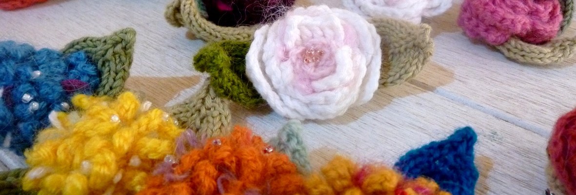 Trois brins de laine pour épingler à nos petites vestes des broches de fleurs multicolores, trois autres petits brins pour en mettre aussi en couronnes dans nos cheveux …