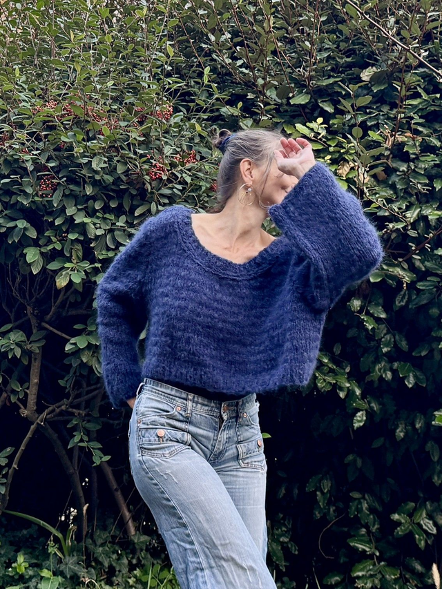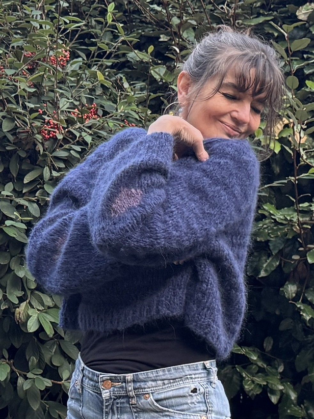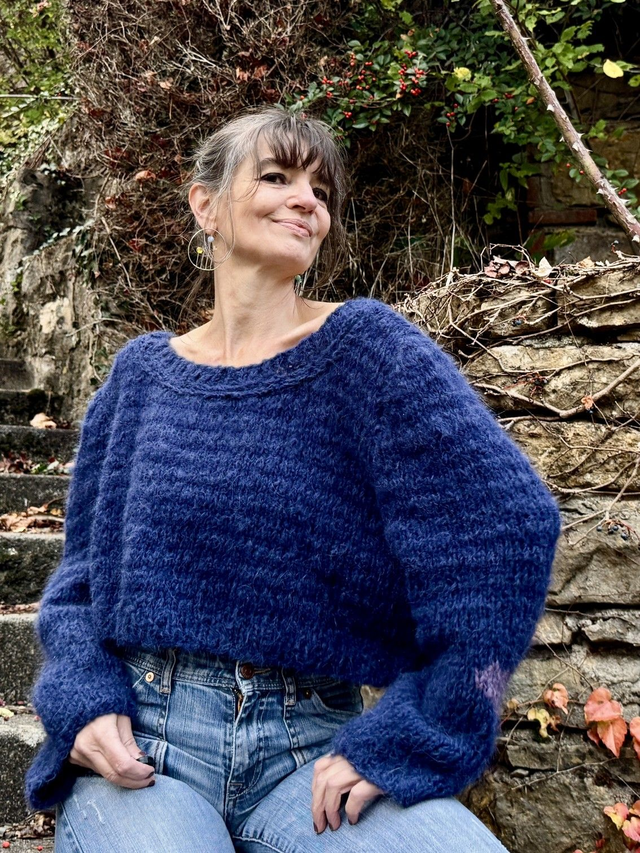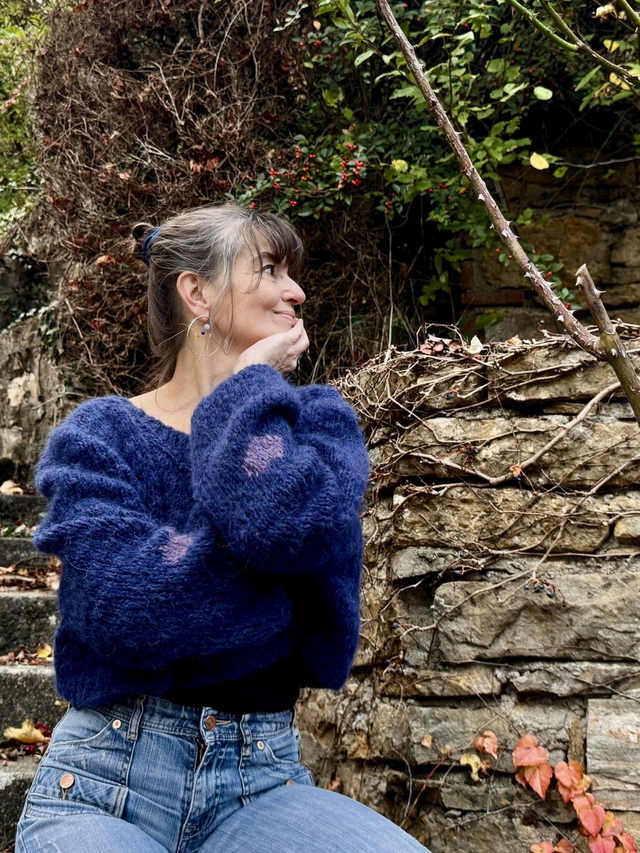 Petit pull court en laine toute douce et chaude coloris bleu saphir avec motifs cœurs en intarsia sur les manches . Entièrement tricoté à la main.