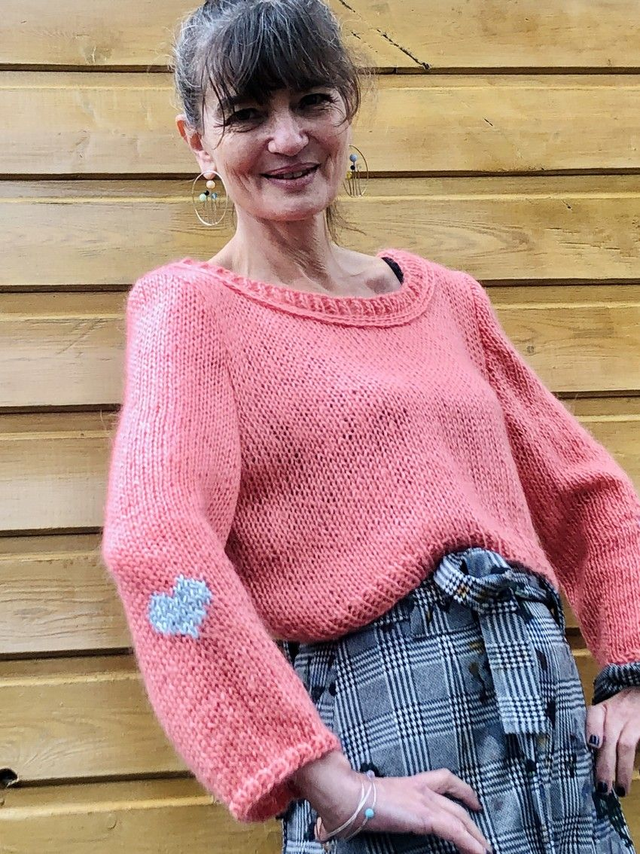 Petit pull court en laine toute douce coloris corail avec motifs cœurs en intarsia sur les manches . Entièrement tricoté à la main.