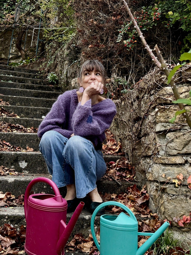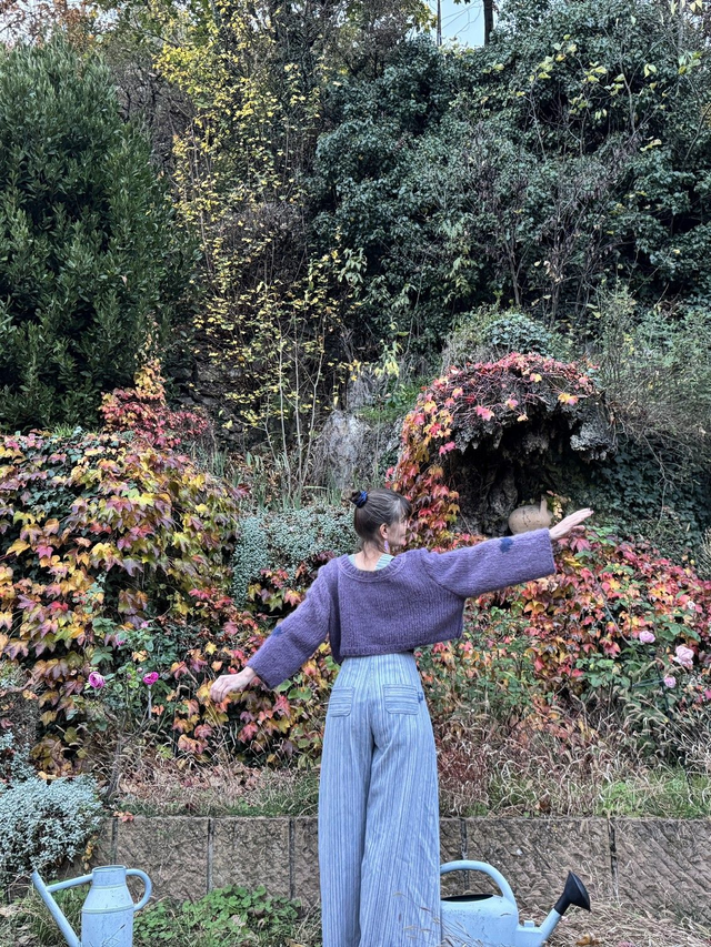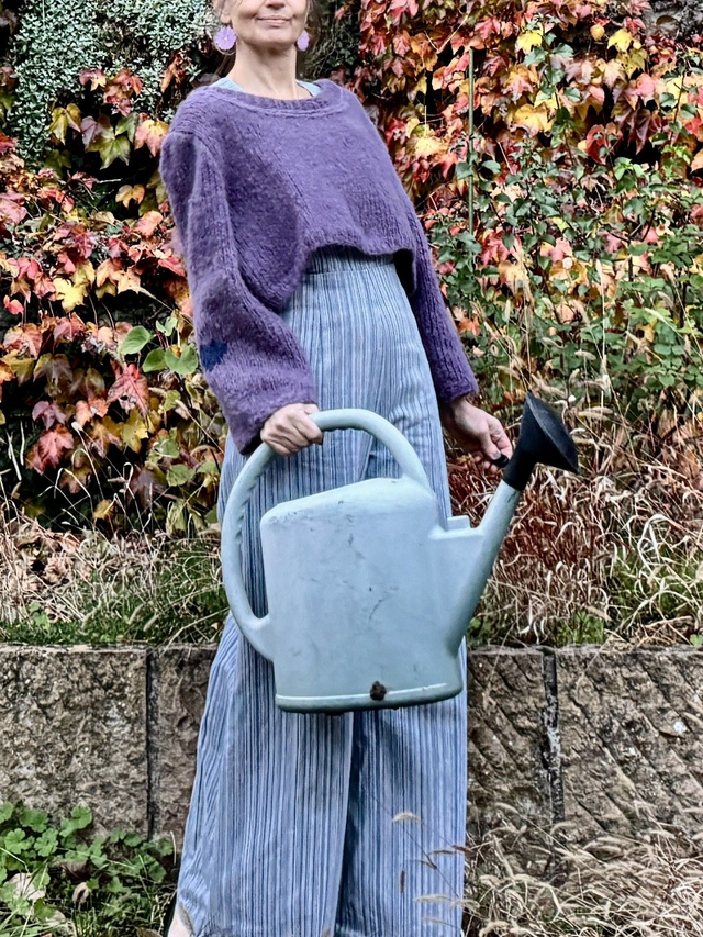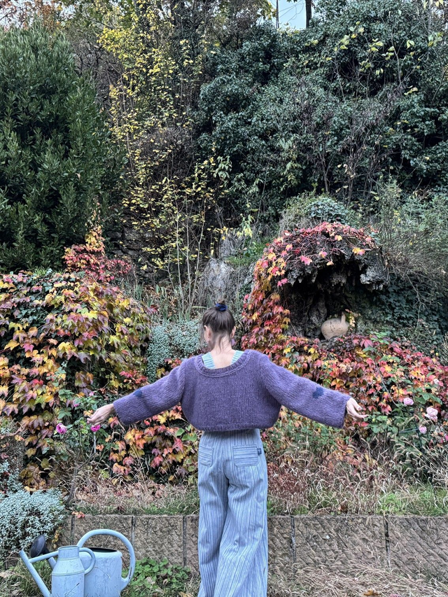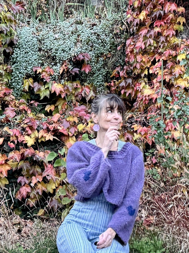 Petit pull court en laine toute douce et chaude coloris mauve avec motifs cœurs en intarsia bleu sur les manches . Entièrement tricoté à la main.