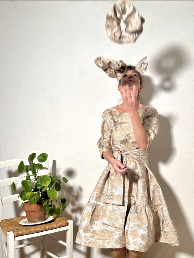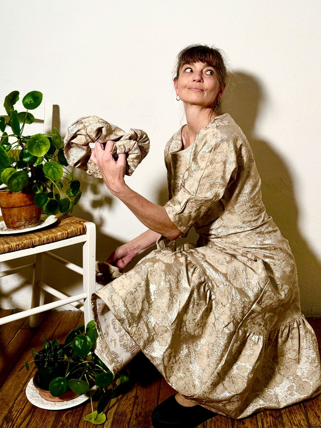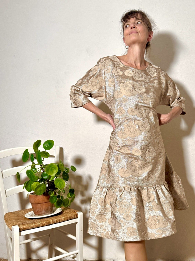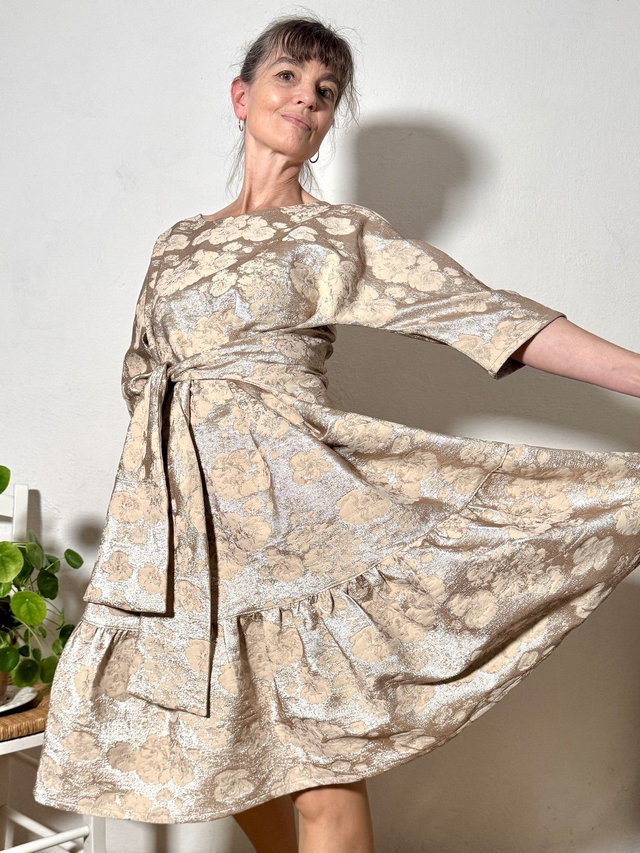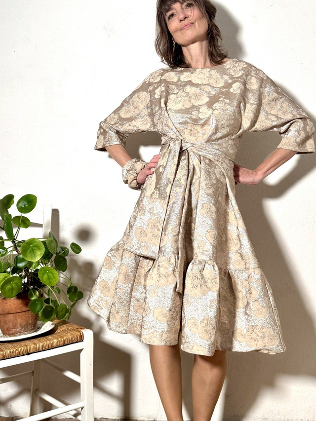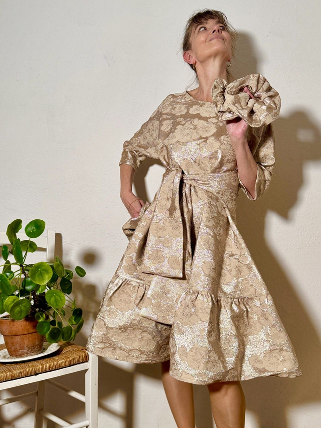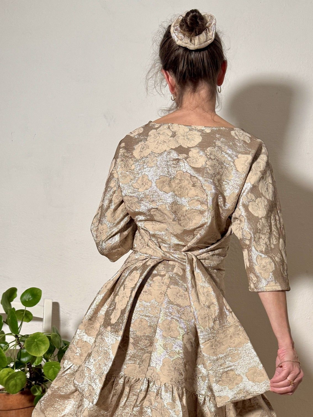 La plus festive et scintillante robe Folkado, ajustable (sa taille S va du 36 au 40), se nouant sous la poitrine ou dans le dos, en brocard polyviscose doré -tissu issu des stocks dormants de maison de couture -
